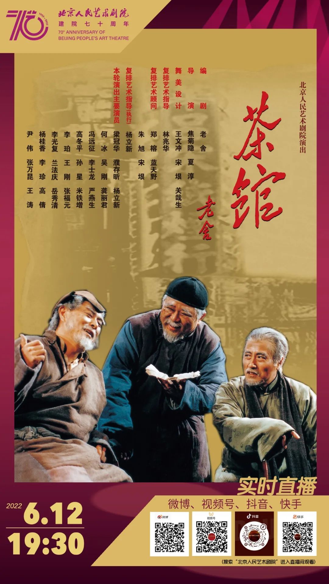 6月12日院庆当天上演的70周年纪念版《茶馆》中,1999年第二代经典演员阵容将再度集结,包括梁冠华、濮存昕、杨立新、何冰、吴刚、龚丽君、冯远征、李士龙、严燕生、高冬平、孙星、米铁增、李珀、王刚、张福元 、李光复、兰法庆、岳秀清、杨桂香、李珍、高倩、尹伟、张万昆、王涛等在内的深受观众喜爱的人艺演员们将悉数亮相首都剧场舞台,再度讲述老裕泰50年的沧桑巨变,在经典演绎中体味人艺的历史记忆。本次《茶馆》由杨立新担任执行复排艺术指导,是北京人艺历史上首次利用8K技术录制,并通过高清镜头同步在线直播演出。