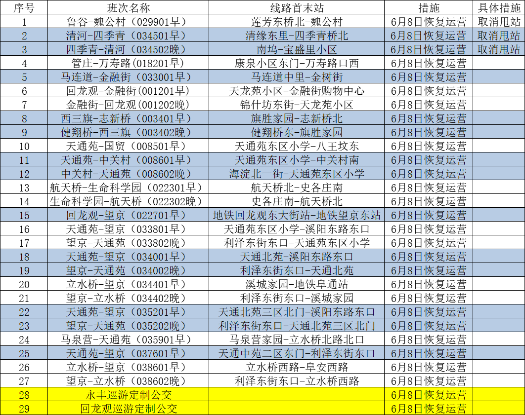 按照疫情防控工作要求,自6月8日首班车起,27条定制公交线路恢复运营,2个区域巡游定制公交恢复运营,具体情况见下表。请广大乘客提前安排出行计划,乘车时遵守防疫要求。