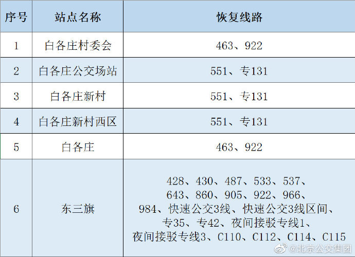 2022年6月14日,据@北京公交集团 的消息,按照防疫工作要求,对途经昌平区白各庄村、东三旗周边地区的6处公交车站采取甩站措施的24条线路,自6月15日首班车起,恢复正常运营。