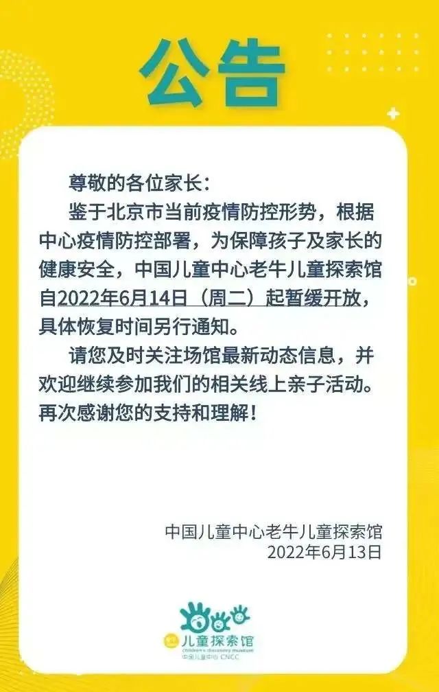2、6月14日起,中国儿童中心老牛儿童探索馆暂缓开放。