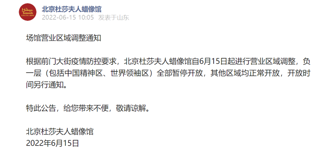 3、6月15日起,北京杜莎夫人蜡像馆进行营业区域调整,负一层(包括中国精神区、世界领袖区)全部暂停开放,其他区域均正常开放。