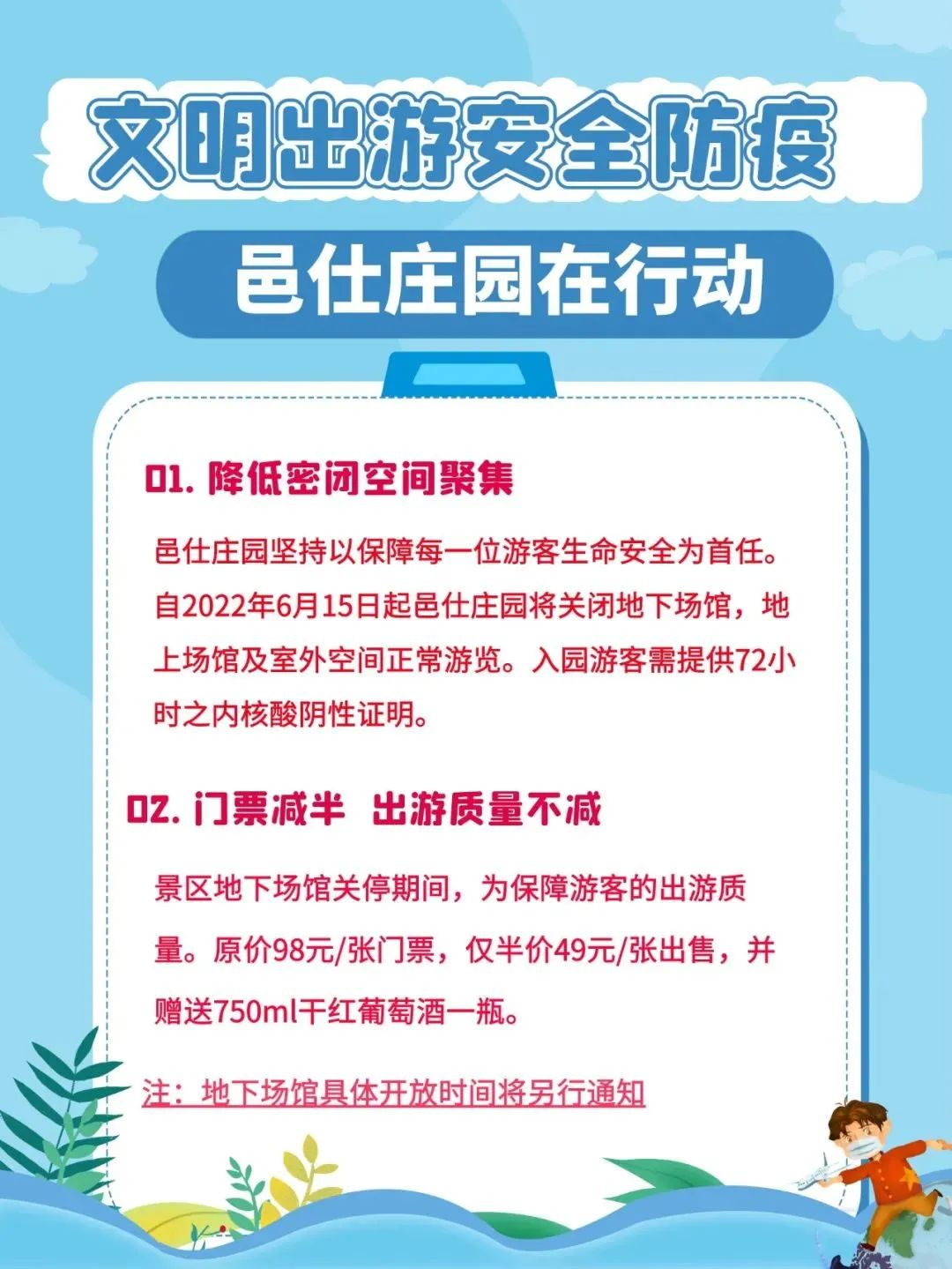 1、6月15日起,邑仕庄园关闭地下场馆,地上场馆及室外空间正常游览。