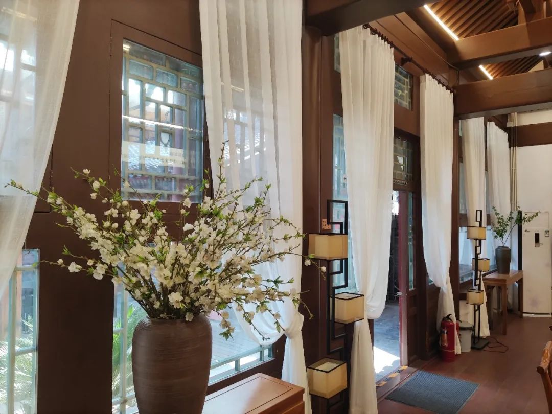 拾阶而上,轻轻推开朱红色的院门,步入庭院廊道,映入眼帘的是朱红色梁柱和朱红墨绿相间的门窗,青砖黛瓦、画栋雕梁。环顾整个庭院建筑,庄重的传统色调、精湛的传统工艺,整体布局和每个细节都体现出中式建筑的深幽意蕴和大气端庄。古风古色的庭院里,金桔垂挂,竹影婆娑,蝶飞虫鸣天籁之声不绝于耳。