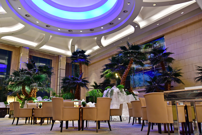 棕榈苑大堂吧位于酒店一层,独有的地中海风格,高矮相间的棕榈树,错落有致的山石,绵软的地毯......自然采光的通顶落地窗、挺拔的棕榈树,阳光在半圆形玻璃穹顶的折射下,透过棕榈叶温柔拂过每一个角落。夜晚梦幻时分,点一杯夏日饮品,伴着曼妙的音律,仰望朗朗星空,迷醉在星际的无限浪漫中......