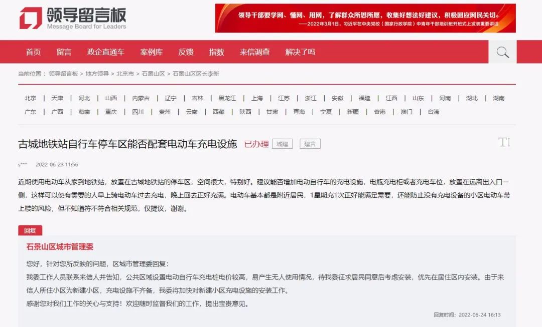 近日,有市民建议在古城地铁站增加电动自行车的充电设施。区城市管理委回复:公共区域设置电动自行车充电桩电价较高,易产生无人使用情况,待我委征求居民同意后考虑安装,优先在居住区内安装。由于来信人所住小区为新建小区,充电设施不齐备,我委将加快对新建小区充电设施的安装工作。