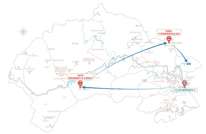 门城双峪路旅游集散中心 → 马栏村冀热察挺进军司令部旧址 → 妙峰山平西情报联络站纪念馆 → 返程