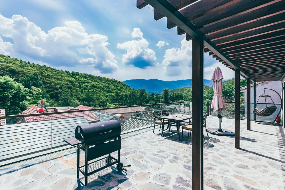 整体建筑风格,采用改良后的传统垒砌之法,就近取自山间的原石,因形构建成坚固粗犷的墙壁、院墙、阶梯、扶廊,彰显原生态的苍劲;又以原木构件作梁作顶,另添一番木质的温柔,形成独具旨趣的现代中式建构特点。