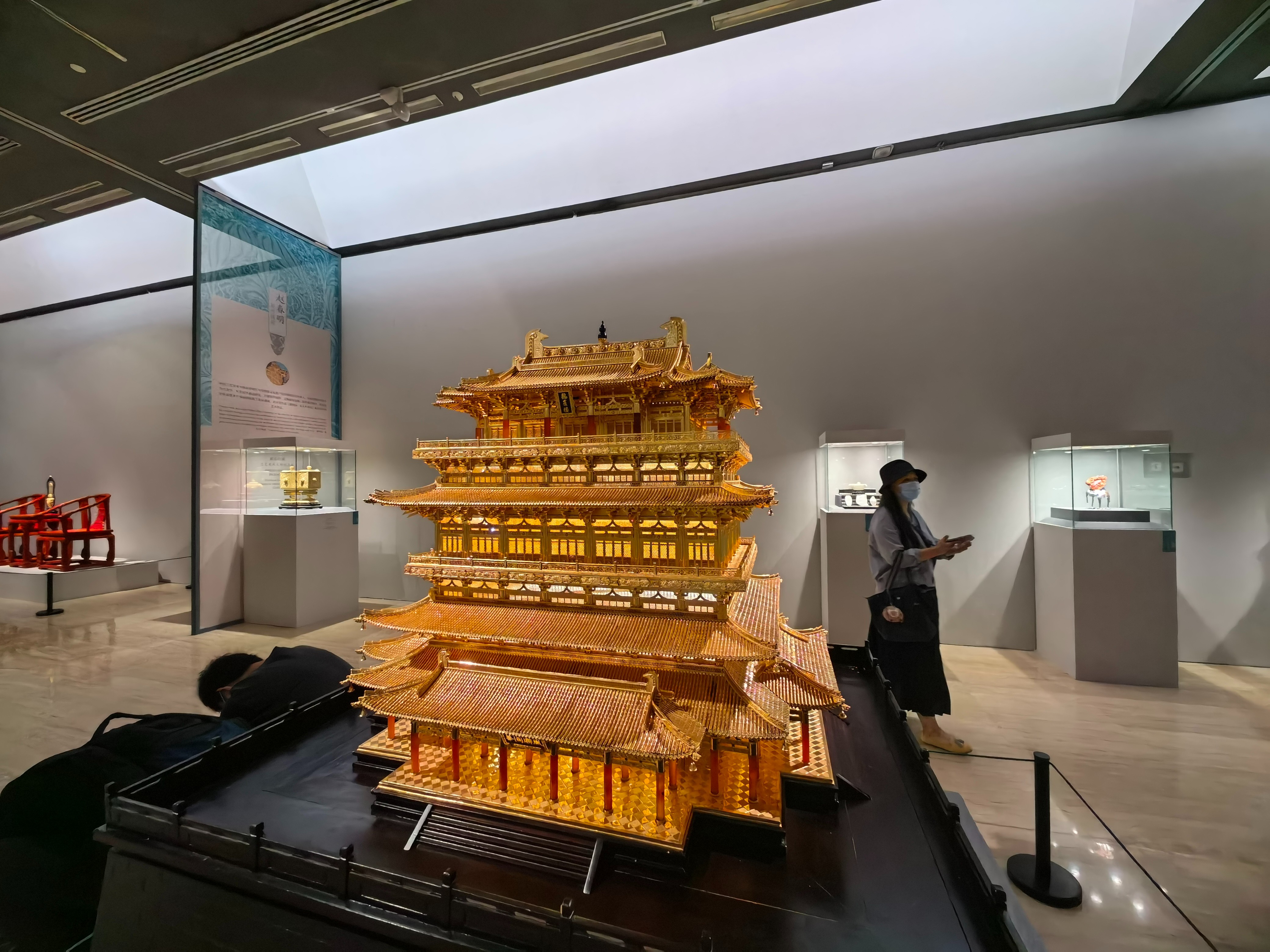 在展览现场,一座一米多高的花丝镶嵌《鹳雀楼》格外耀眼,其创作者中国工艺美术大师赵春明是非物质文化遗产花丝镶嵌技艺传承人,主张将传统技艺与当代美学结合。《鹳雀楼》整体由几十万个部件组成,耗时3年,用料达100多公斤,制作难度极大,虽然是缩制,但不失其雄伟壮观。在楼体内部灯光的烘托下,更凸显了花丝玲珑剔透的美感。