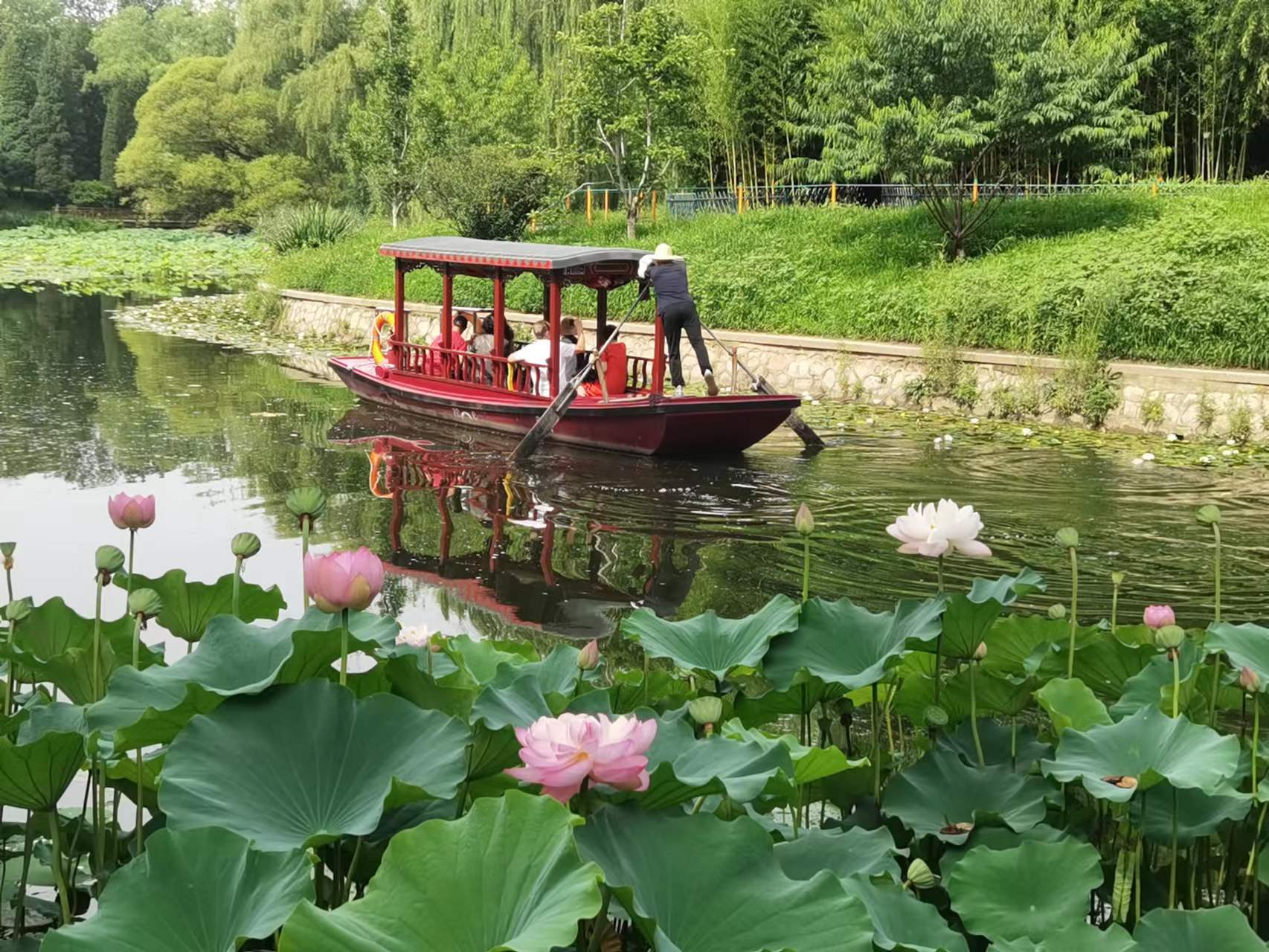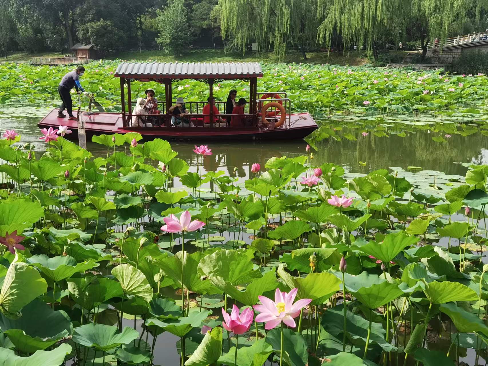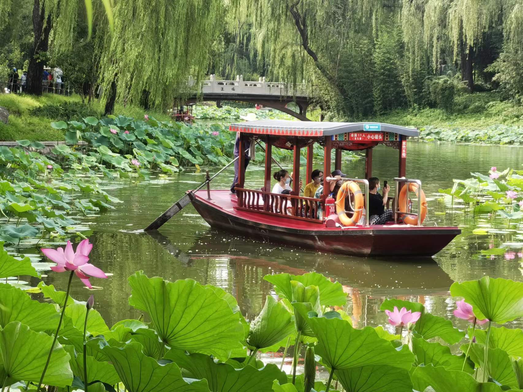 7月11日,游客登上紫竹院公园荷花渡景区摇橹小木船,在800米长的航道内缓缓前行,近距离欣赏沿途碧绿丛中盛开的各色荷花。在盛夏时节,来紫竹院公园乘船观荷花,成为京城避暑休闲的好去处。