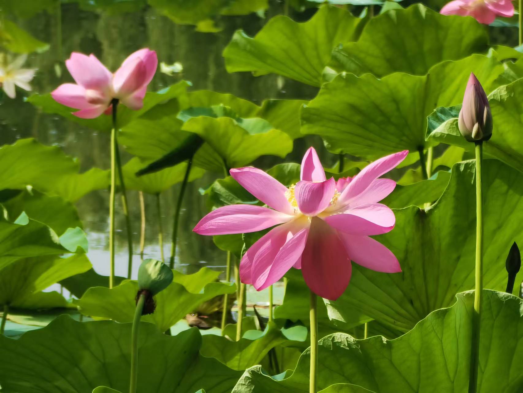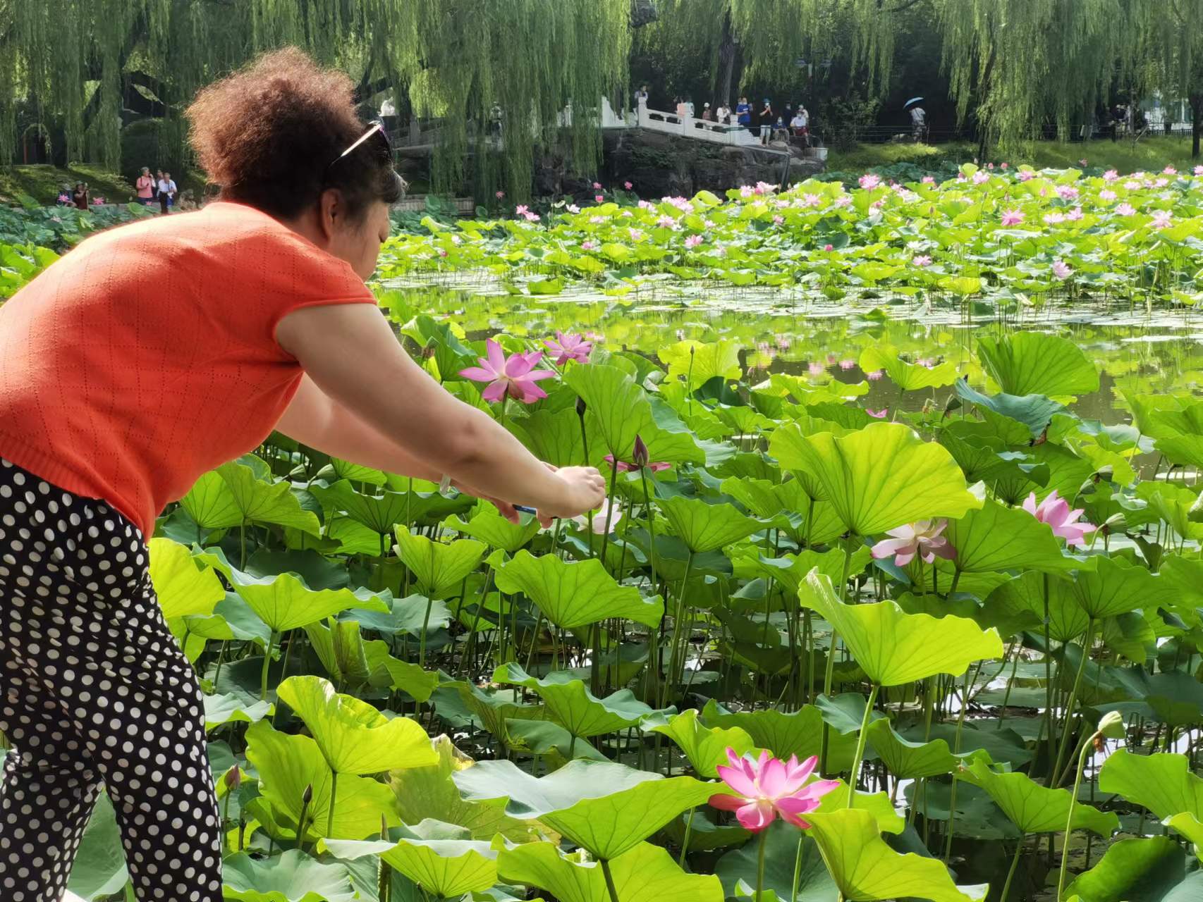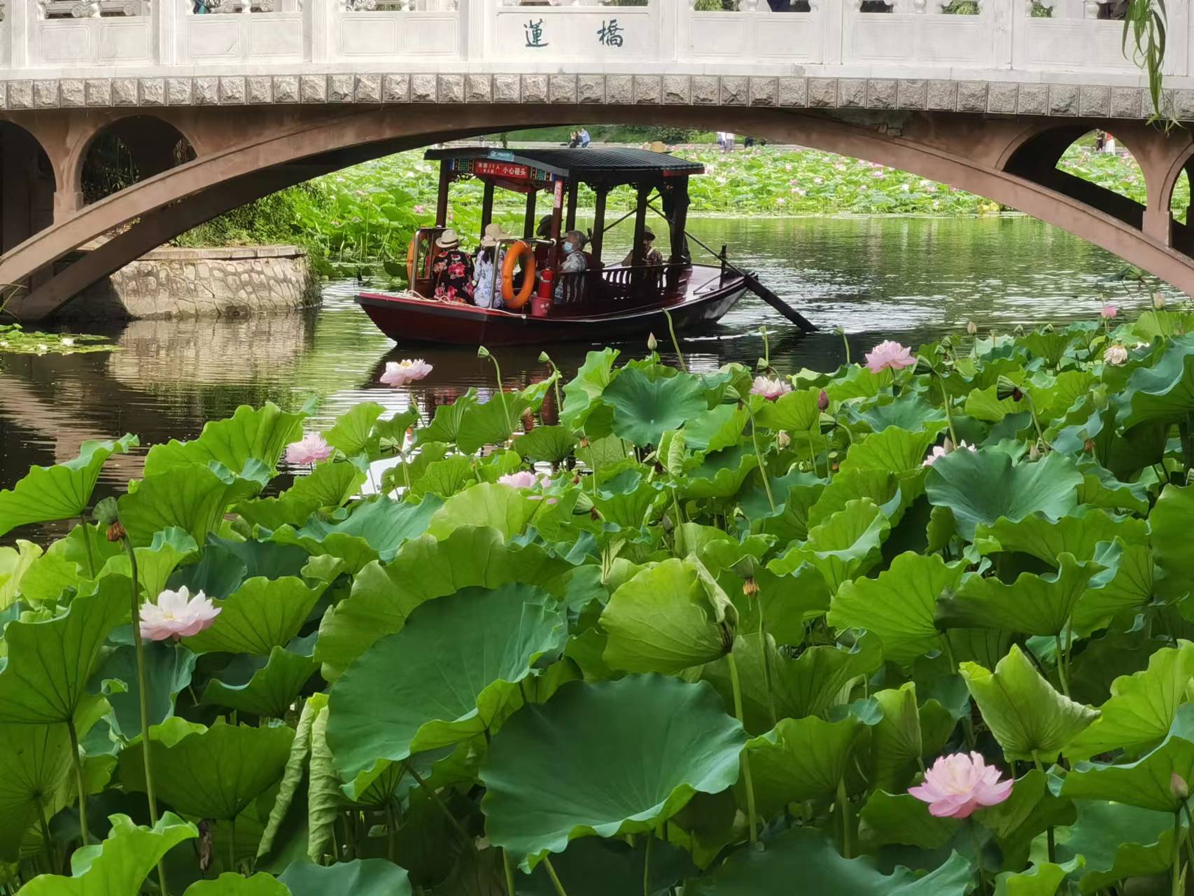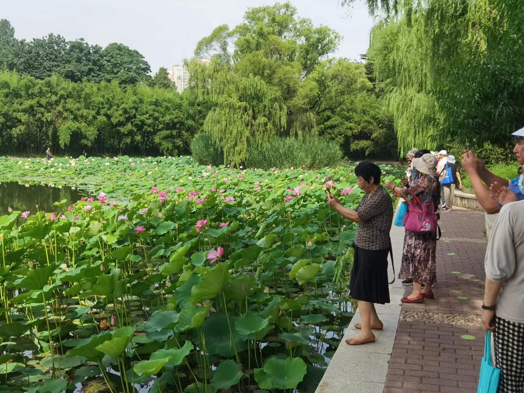 7月11日,游客登上紫竹院公园荷花渡景区摇橹小木船,在800米长的航道内缓缓前行,近距离欣赏沿途碧绿丛中盛开的各色荷花。在盛夏时节,来紫竹院公园乘船观荷花,成为京城避暑休闲的好去处。