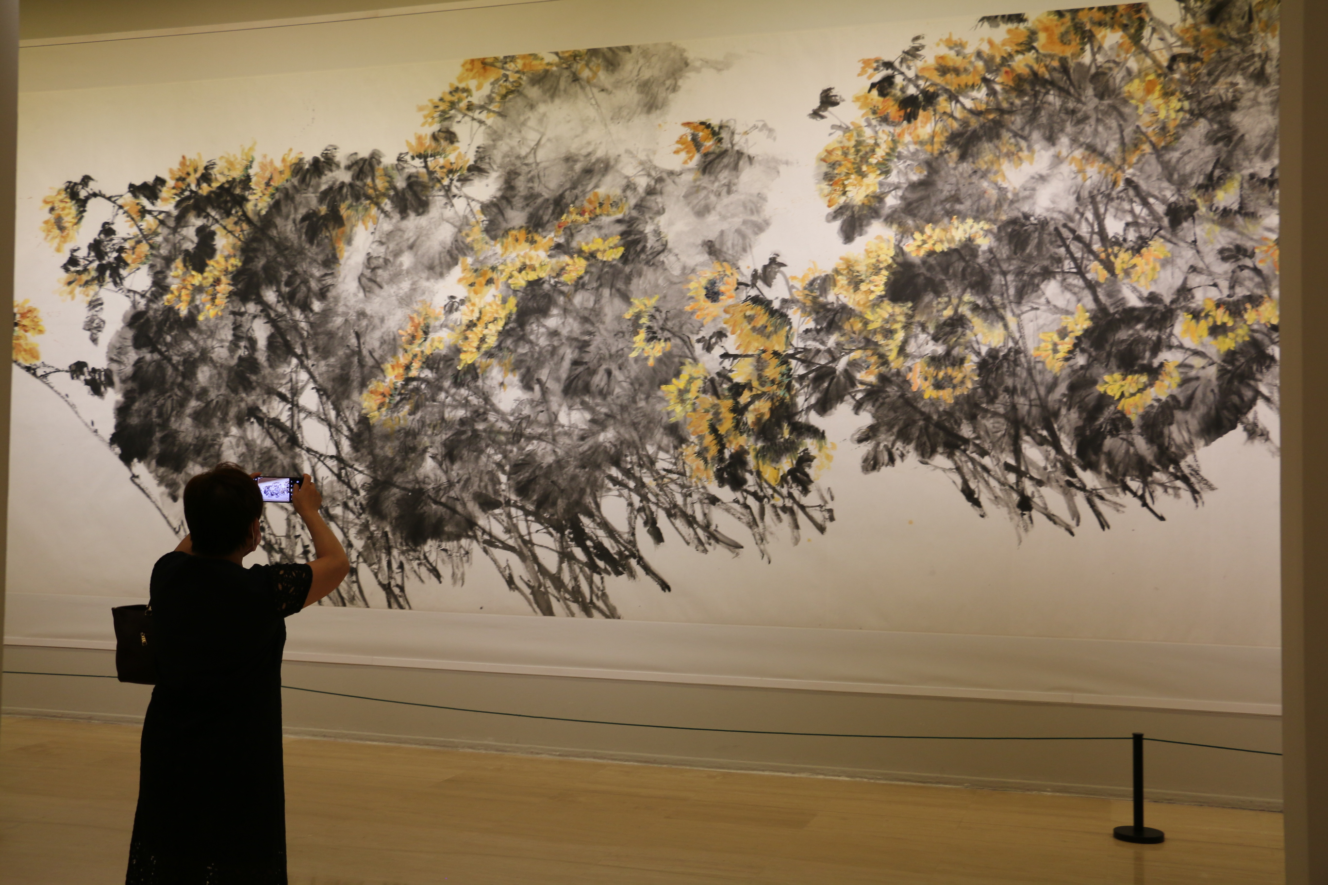在展览现场,一幅11米长卷《百花向阳》演绎出繁花的交响,一片茂盛的向日葵如潮叠起,如浪沓来。近两年刘海勇前往新疆腹地的胡杨林写生,在沙地上铺毡挥写,以师造化之笔描摹胡杨野性之美,创作了《胡杨颂》系列作品。展览还展出了刘海勇以雁荡山乡土花树为题材的画作,呈现雁荡山对画家身心之哺育,并通过“炼笔养境”部分的作品,表达他在教学相长中的感悟。