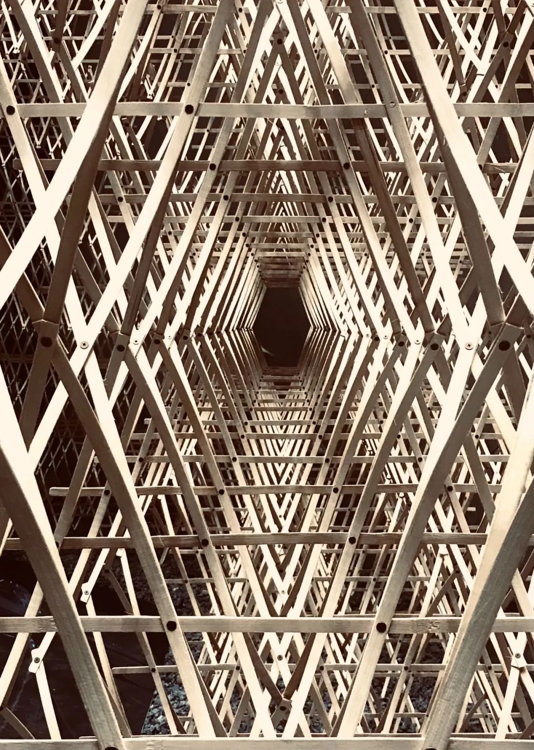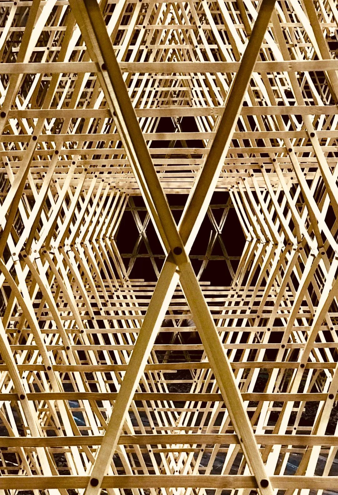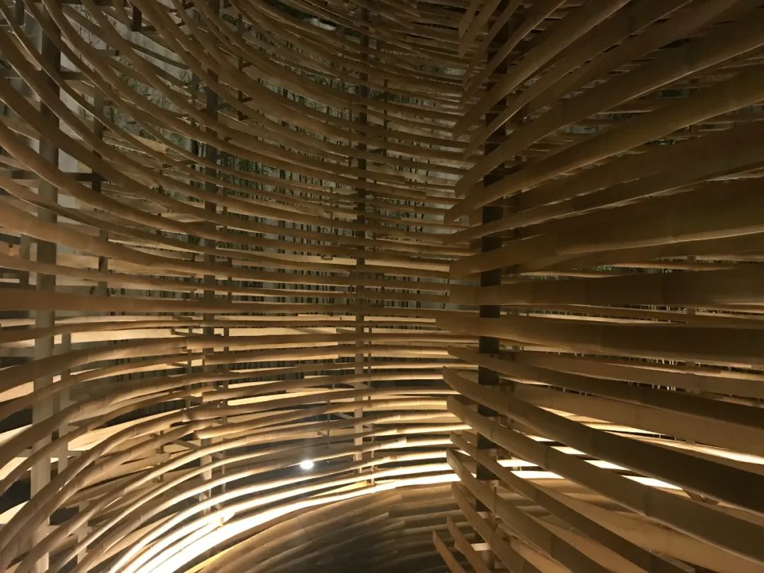 无数的竹条形成幅度与曲率不尽相同的“曲线”,谱写出一场优美的协奏曲,延伸出平缓的螺旋形状。如同书法笔势中蕴含的呼吸感,又如同东洋乐器中的微带杂质的音色。竹的流动描画着摇曳的螺旋,映照出竹林错落的光影,营造出一个像是突然出现在静谧竹林中的茶室空间。穿过“竹曲”的入口,开启一扇通往漫游在精神世界的门。