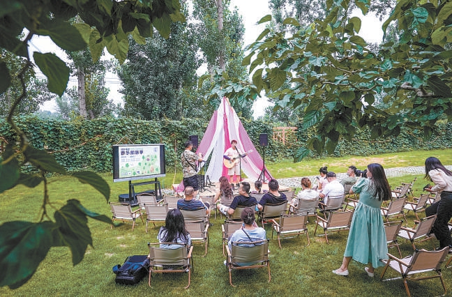 近日傍晚,在大兴区安定镇御林古桑园,游客在百年桑树下,听音乐、品美食,悠闲度夏。今天启动的安定镇“啤酒音乐部落季”,设置露营帐篷区、露天电影放映等项目,邀市民感受别样的京郊夏日夜经济。 本报记者 武亦彬摄