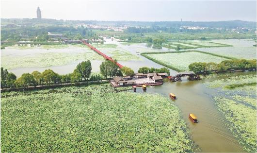 炎炎夏日,游船避暑。近日,山东省济宁市微山湖旅游区吸引了络绎不绝的游客前来游览观光。近年来,通过增殖放流、退渔还湿、退养还湖等一系列措施,微山湖旅游区水质长期稳定在地表水三类标准,鱼类陆续恢复到近百种,水生植物78种。景区里,荷花盛开,鱼翔浅底,鸟儿嬉戏,呈现出一幅“水清荷绿鸟飞翔”的生态美景。