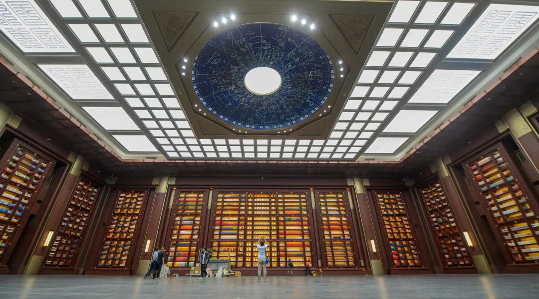 走进位于国家版本馆主建筑文华堂的国家书房,抬头就能看到宋代石刻天文图的星空穹顶。国家书房内陈列着具有传世价值的上万册中外经典出版物版本。