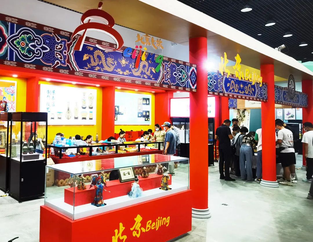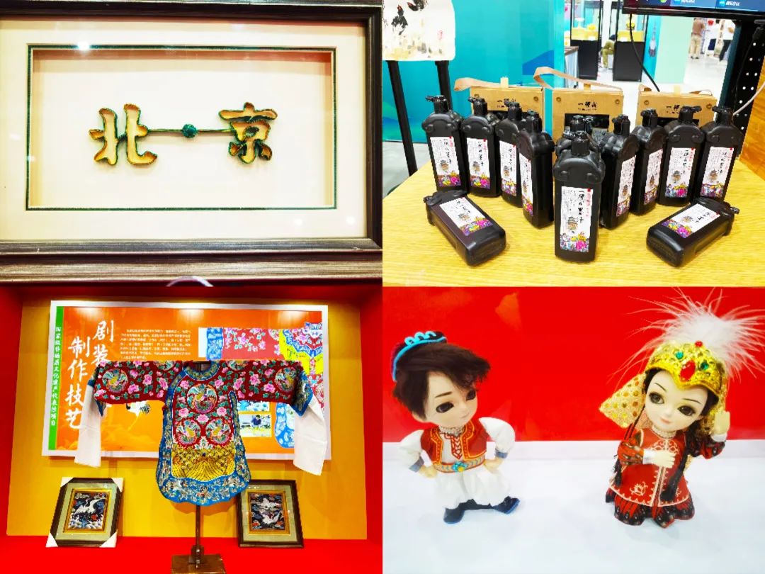 北京展区整体设计以太和殿造型为思路,展示了太平、和睦的传统文化理念,展台设置巧妙,体现出北京非遗的走心暖心,包含触景生情(景泰蓝作品)及双奥之城(依托和田玉设计制作的2008北京奥运会金镶玉奖牌和北京冬奥徽宝);千里共婵娟(身着新疆民族服装的北京绢人);粉墨登场(为适应新疆气候专属开发的一得阁墨汁);金玉良缘(与新疆传承人共同研究的花丝镶嵌作品);国粹芳华(展示梅兰芳先生设计的贵妃戏装,剧装厂帮助新疆制作的戏装作品)共五个板块。
