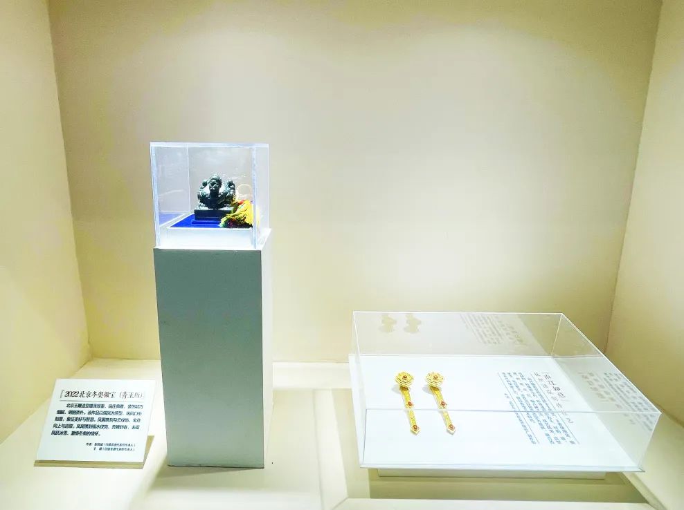 独具匠心的非遗作品、文创产品精彩亮相,在新疆这个一带一路上的核心区、枢纽地带打造京新非遗共建共享的主阵地。2021年,北京市文化和旅游局委托中央美术学院举办了中青年非遗传承人高级研修班,以“文化润疆、以美育人”为主题,聚焦和田玉雕刻技艺的传承与创新发展,选拔了20位和田玉雕刻技艺非遗传承人、从业者进行集中培训。在此次展览的创新成果展示区里,也重点展示了研修班的丰硕成果。