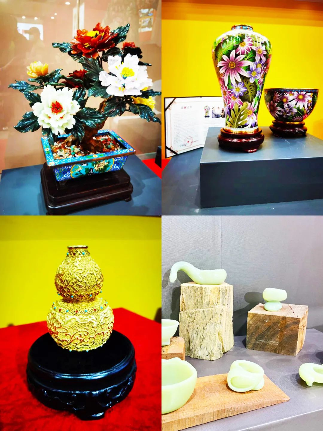北京玉雕玉石盆景-富贵牡丹作品(左上) 景泰蓝繁花似锦赏瓶作品(右上) 花丝镶嵌宝相葫芦作品(左下)北京玉雕特色展品(右下)