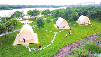 作为国家生态旅游示范区,“双城”间重要生态屏障,东丽湖生态本底优良,水域面积达8平方公里,分为东湖和丽湖,此次新建露营营地位于东湖公园内。沿湖堤岸上,设立着一栋栋白色帐篷。据运营公司负责人介绍,东丽湖露营营地占地面积44000平方米,设有西餐咖啡区、户外烧烤区等6大主题区域,配有独立的饮水和污水处理系统。