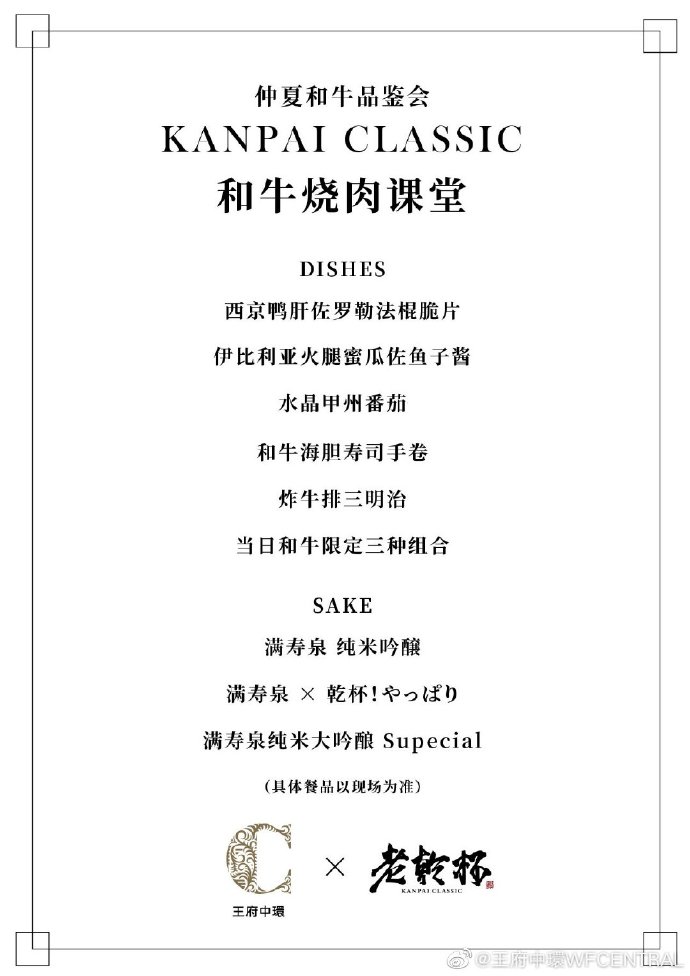 本周六晚18:00-19:00,来自老乾杯和牛烧肉店,于王府中環西座西侧草堂设下一堂“和牛烧肉教室”,备下“和牛海胆寿司手卷”、“炸牛排三明治”、“当日限定和牛三种”等多种老乾杯经典菜品、以及3款满寿泉酒水及惊喜诚意好礼,诚邀各位共赴一场「仲夏和牛品鉴会」,享受专属成熟大人的烧肉美味。
