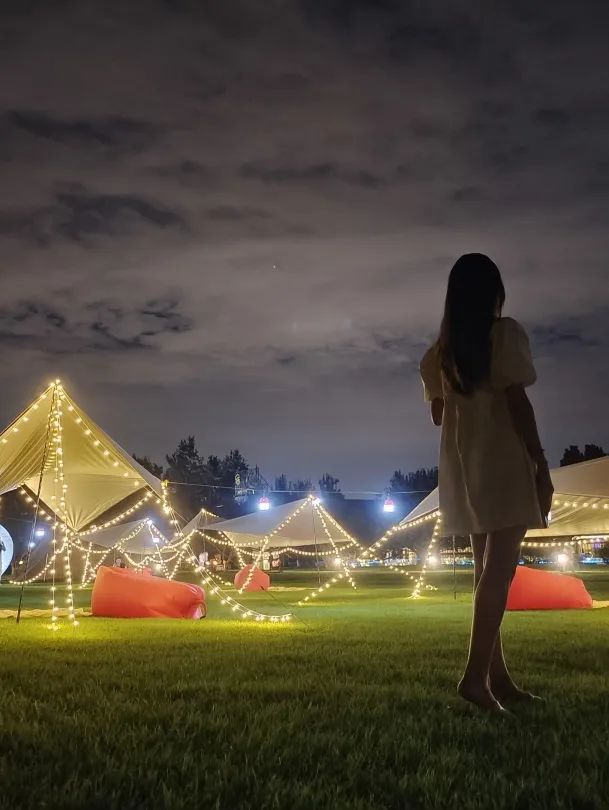 当夜幕降临,帐篷小镇更是美不胜收,串串彩灯流光溢彩,月兔玉盘交相辉映,还不快拉上亲朋好友一起来拍照打卡。