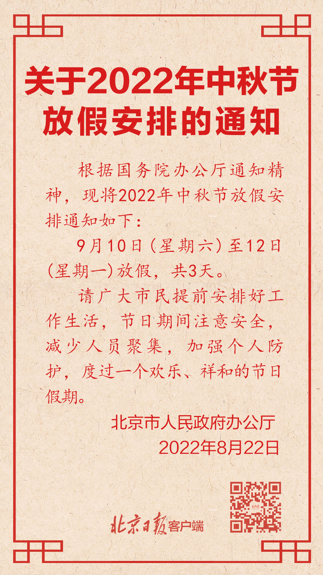 北京市发布中秋节放假安排,共3天,不调休