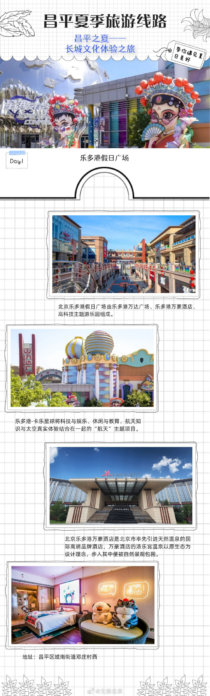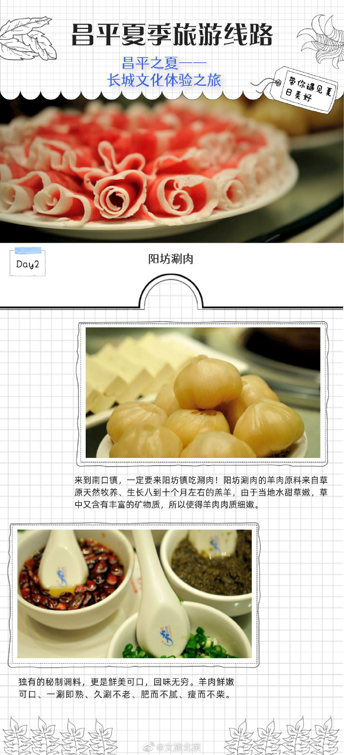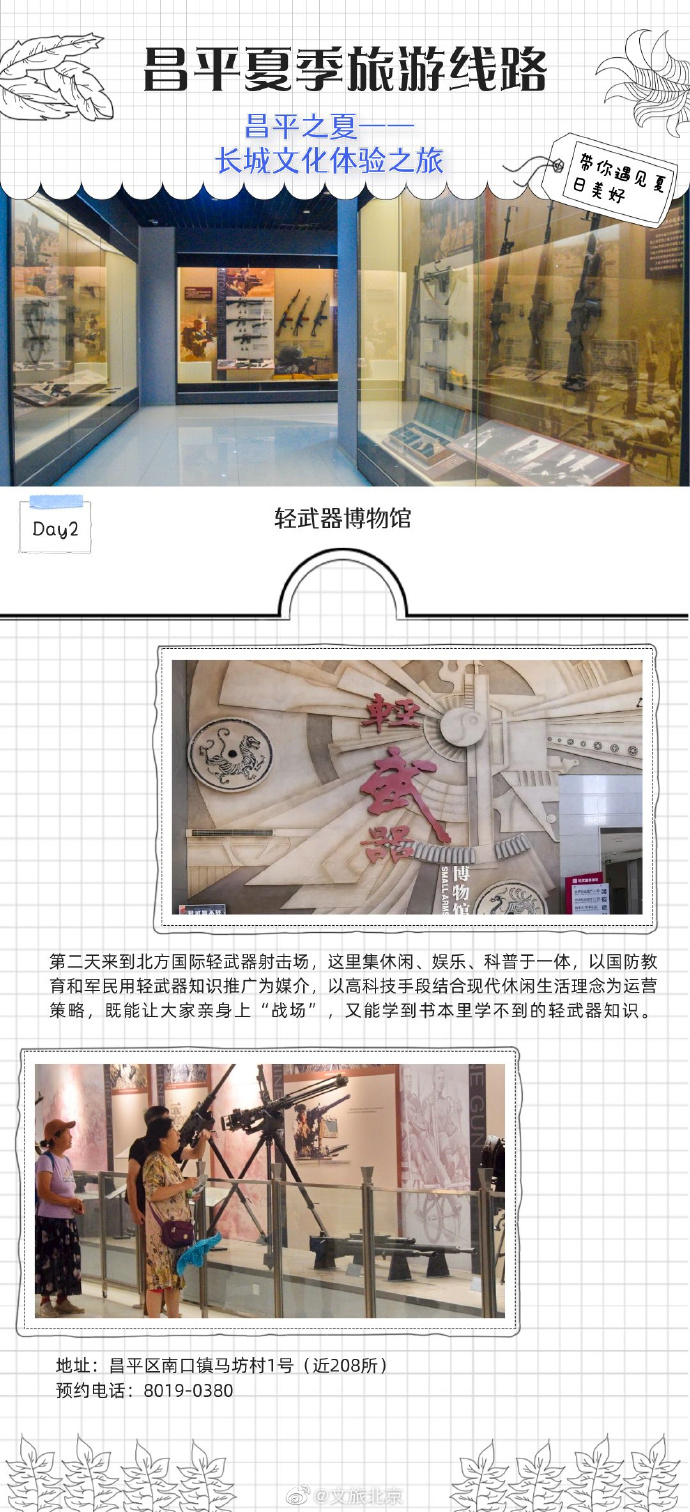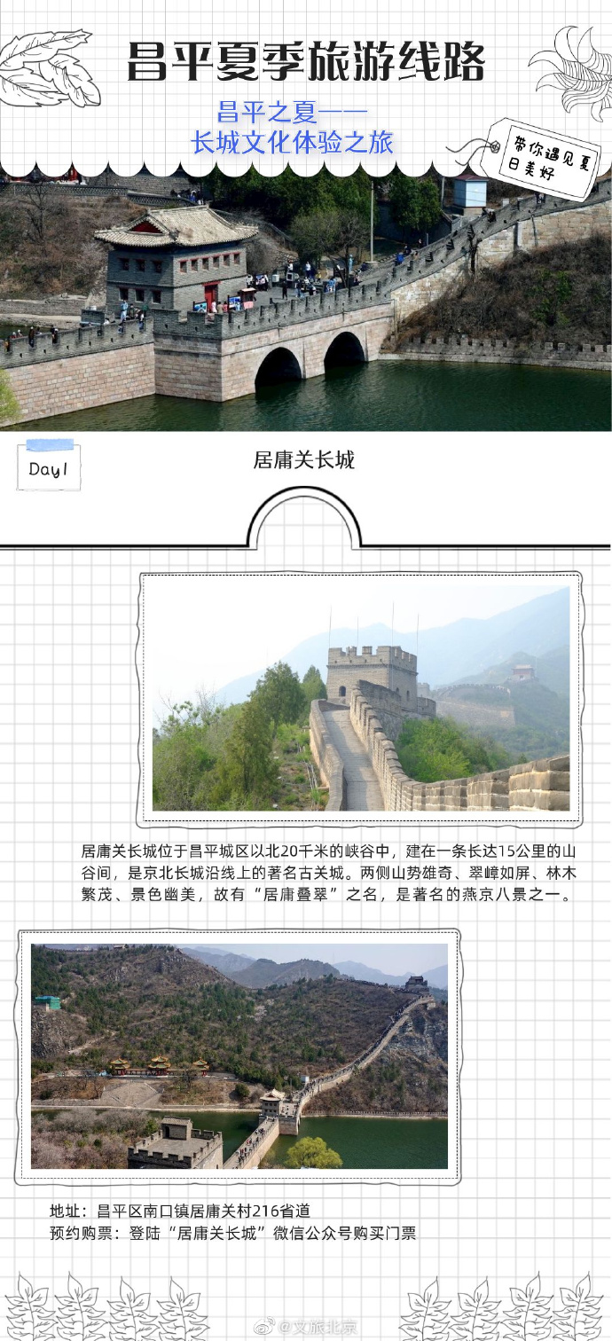 今年夏天,昌平区推出了3条夏季旅游线路,赏美景、品美食、住民宿,享艺术、古典、高科技的多重体验,带你遇见夏日美好。线路三为“长城文化体验之旅 ”,登居庸关长城赏秀丽风景,参观轻武器博物馆,品尝美味的阳坊涮肉,在乐多港尽享欢乐时光。
