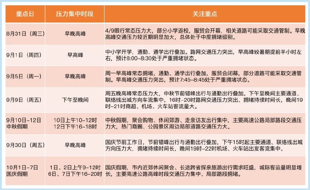 9月全市中小学开学,通勤、通学出行叠加,工作日早晚高峰时段交通压力将明显加大,早高峰压力增长更为显著,压力集中时段较暑期提前半小时左右。周一早高峰、周五晚高峰和周三(4/9限行日)早晚高峰交通压力突出,预计城市路网交通指数峰值达8.0以上严重拥堵状态。