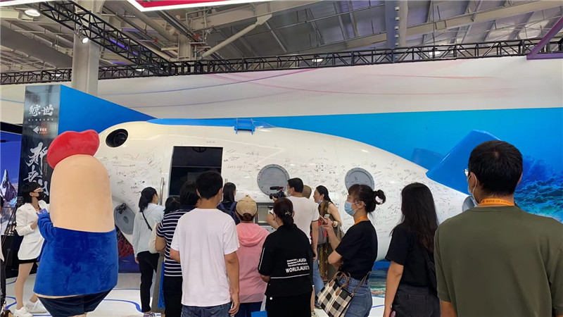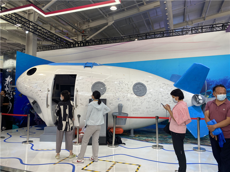 在服贸会首钢园1号馆,您可以体验到在冬奥会期间吸引各国运动员争相打卡的SoReal蛟龙号载人深海模拟体验器。这台体验器首度面向公众就格外引人关注,现场围满了观众。