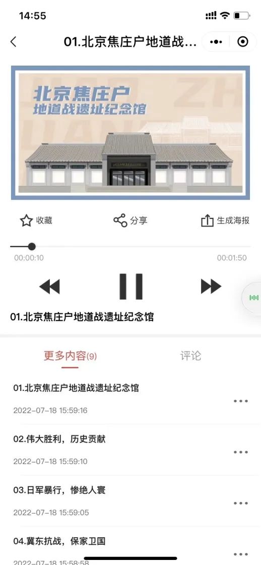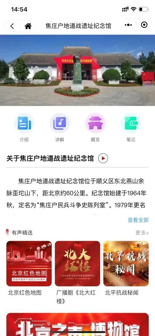 即便足不出户,大家也可以在微信小程序“听听北京之声”里面,进入北京焦庄户地道战遗址纪念馆专属页面,收听焦庄户民兵利用地道给敌人以重创,保护群众生命安全的红色故事。