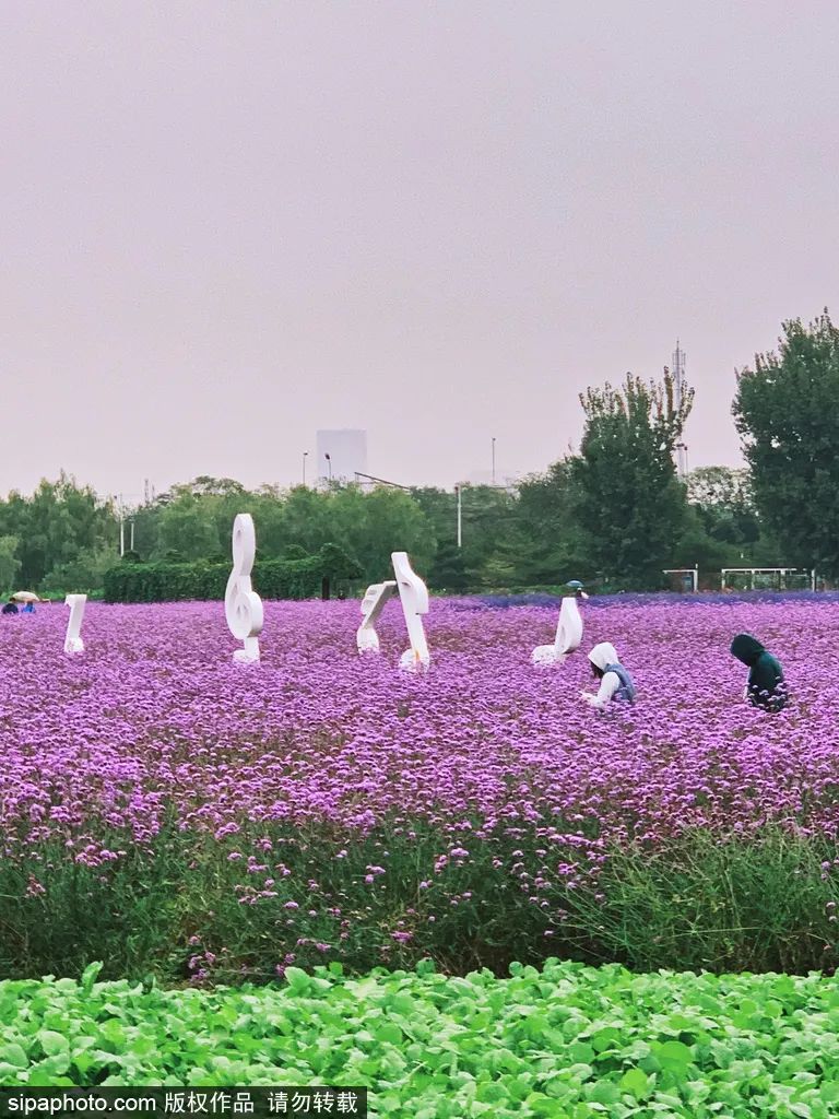 北京市丰台区永定河畔的首农·紫谷伊甸园里,深浅交替的紫色花海绘制出一幅紫色的华章。进入盛花期的薰衣草和柳叶马鞭草同园内几十种花卉竞相开放、争奇斗艳。