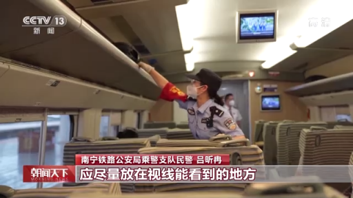 南宁铁路公安局南宁公安处乘警支队四级警长 吕昕冉:旅客朋友在放置自身行李时,应尽量放在视线能看到的地方,乘坐卧铺休息时,贵重财物应放在枕头附近,不要放在走廊、过道等位置,以免丢失遗失。