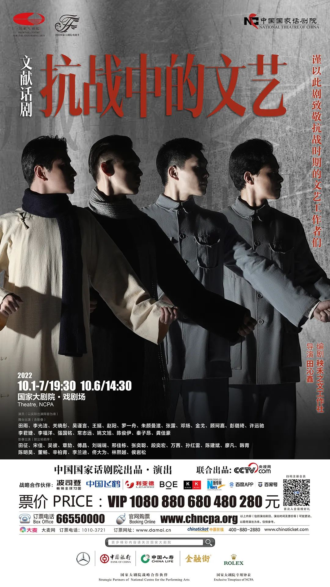 《抗战中的文艺》集结中国国家话剧院诸多优秀主创艺术家和演员,导演田沁鑫、编剧秧禾之文工作社,演员田雨、李光洁、关晓彤、吴谨言、段奕宏、孙红雷、陈建斌、廖凡、辛柏青、佟大为等以舞台出演或影像出演的方式出演,以守正创新的创作态度,向文艺先辈学习,正像左翼电影人夏衍评价聂耳说过,“相信个人天才,更相信集体的力量。”演员在剧中,全体扮演歌队队员的角色,同时扮演抗战史上的文化名人;既是叙事者,又是角色人物。