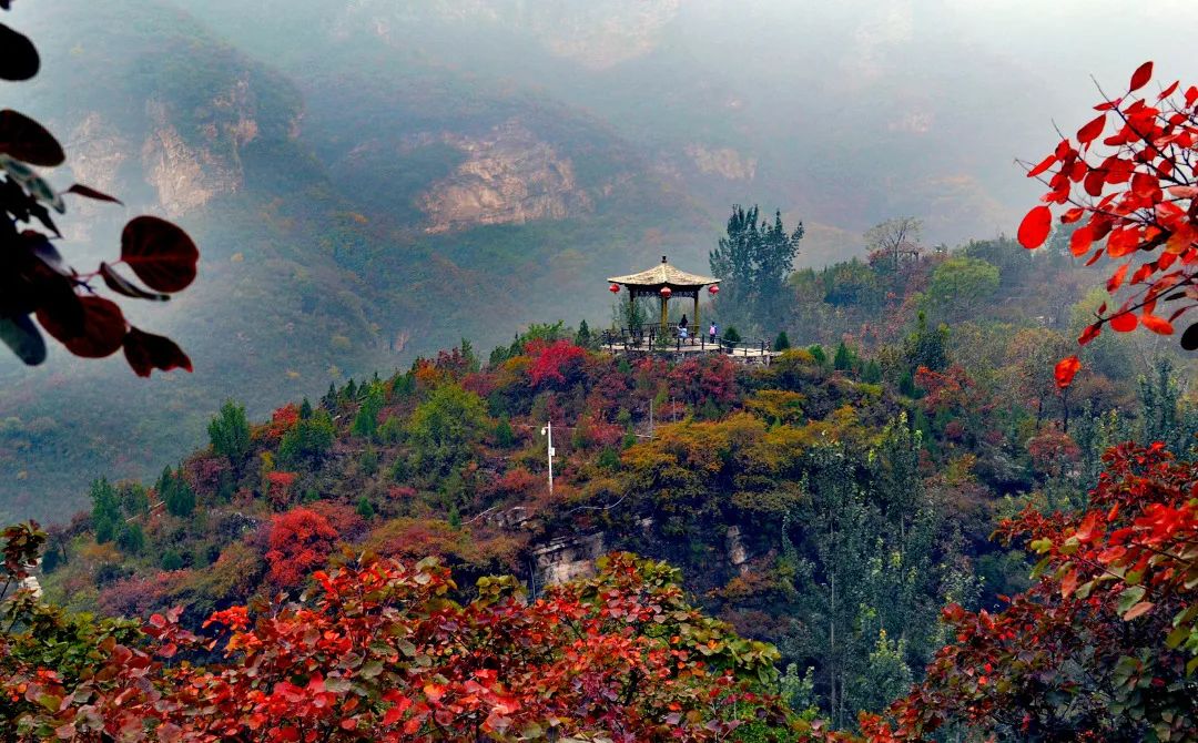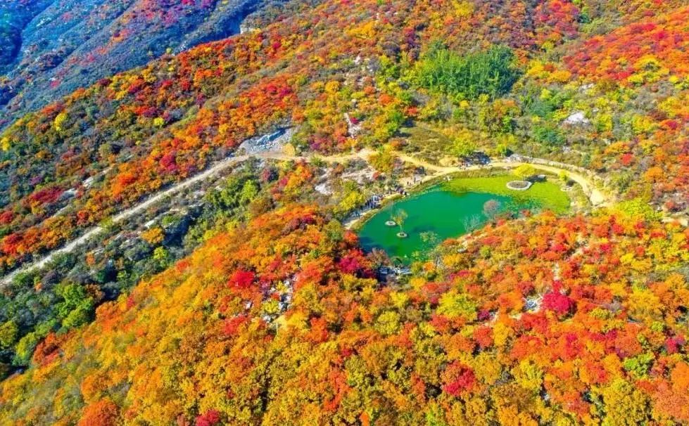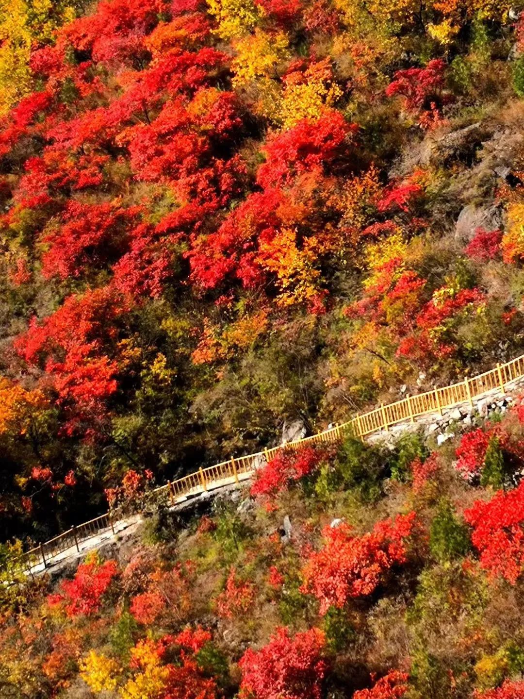 坡峰岭近两万株的黄栌,每到秋天叶子就会变成瑰丽的红,越是深秋其他叶子凋落,黄栌树的红越是缤纷。