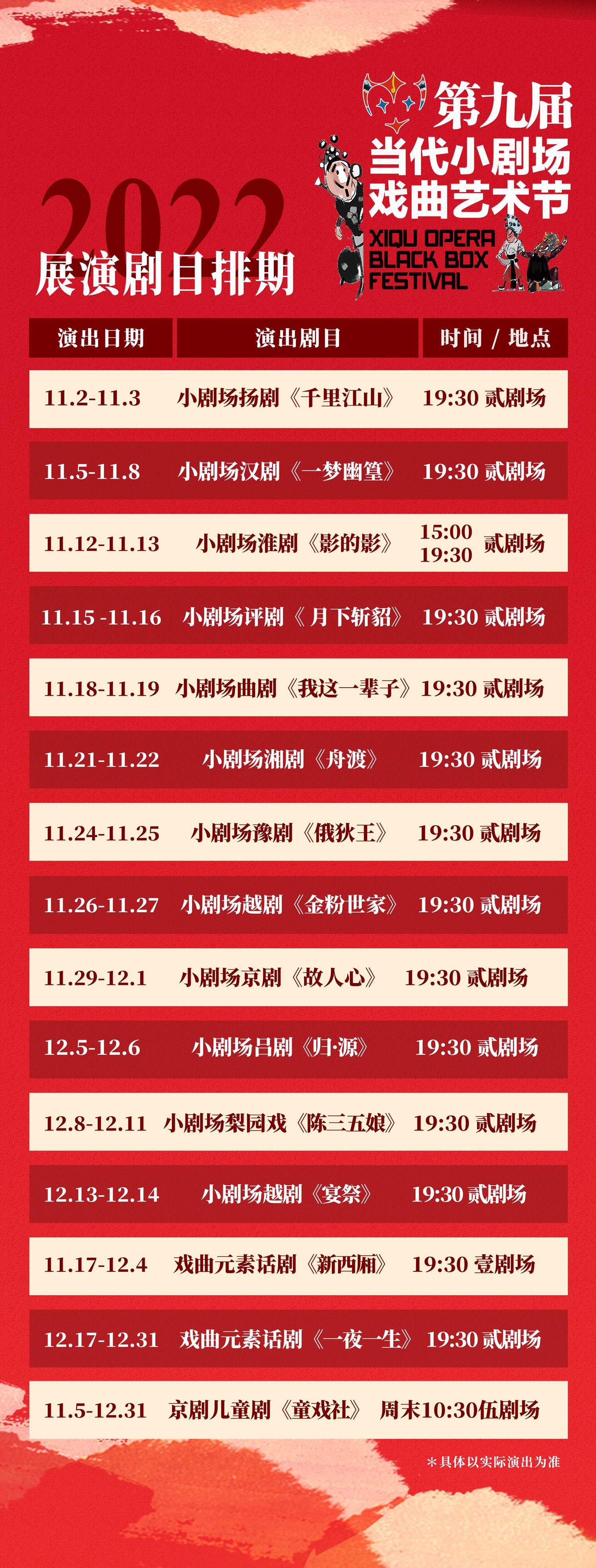 11月2日至12月31日,第十届北京惠民文化消费季之第九届当代小剧场戏曲艺术节在北京繁星戏剧村举办。本届艺术节囊括了京剧、评剧、扬剧、汉剧、淮剧、曲剧、湘剧、豫剧、越剧、吕剧、梨园戏、戏曲元素话剧等11个戏种15部精彩好戏。其中,扬剧、汉剧和吕剧都是首次参加当代小剧场戏曲艺术节。