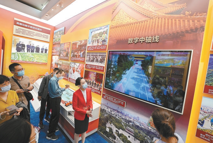 走进“奋进新时代”主题成就展,一块“数字中轴线”互动展示屏前,观众纷纷驻足。