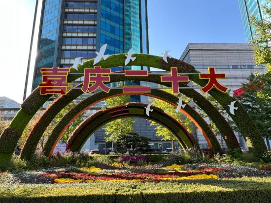 转换后的京西宾馆西门“喜迎(庆)二十大”花坛。