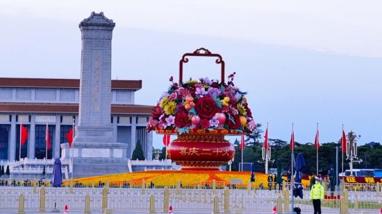 据了解,今年9月,为迎接国庆节和二十大,天安门广场中心布置了“祝福祖国”巨型花果篮,长安街沿线布置主题花坛14处,种植地栽花卉7000平方米,布置容器花卉100组。其中,“祝福祖国”巨型花果篮的篮体南侧书写“祝福祖国,1949-2022”,北侧书写“喜迎二十大”。