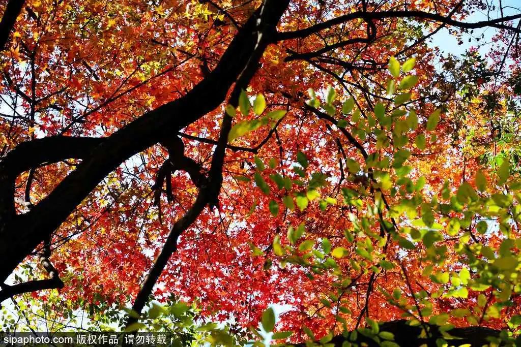 目前红螺寺景区林木变色率已近60%,迎来赏红最佳观赏期。寺内大雄宝殿前的千年银杏树已经开始褪绿变黄,即将进入最佳观赏期。