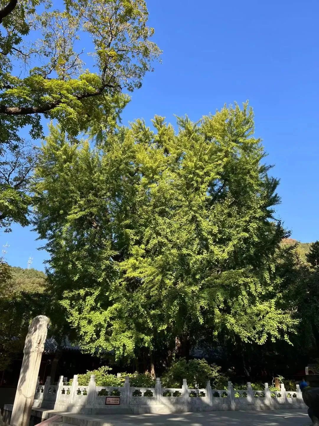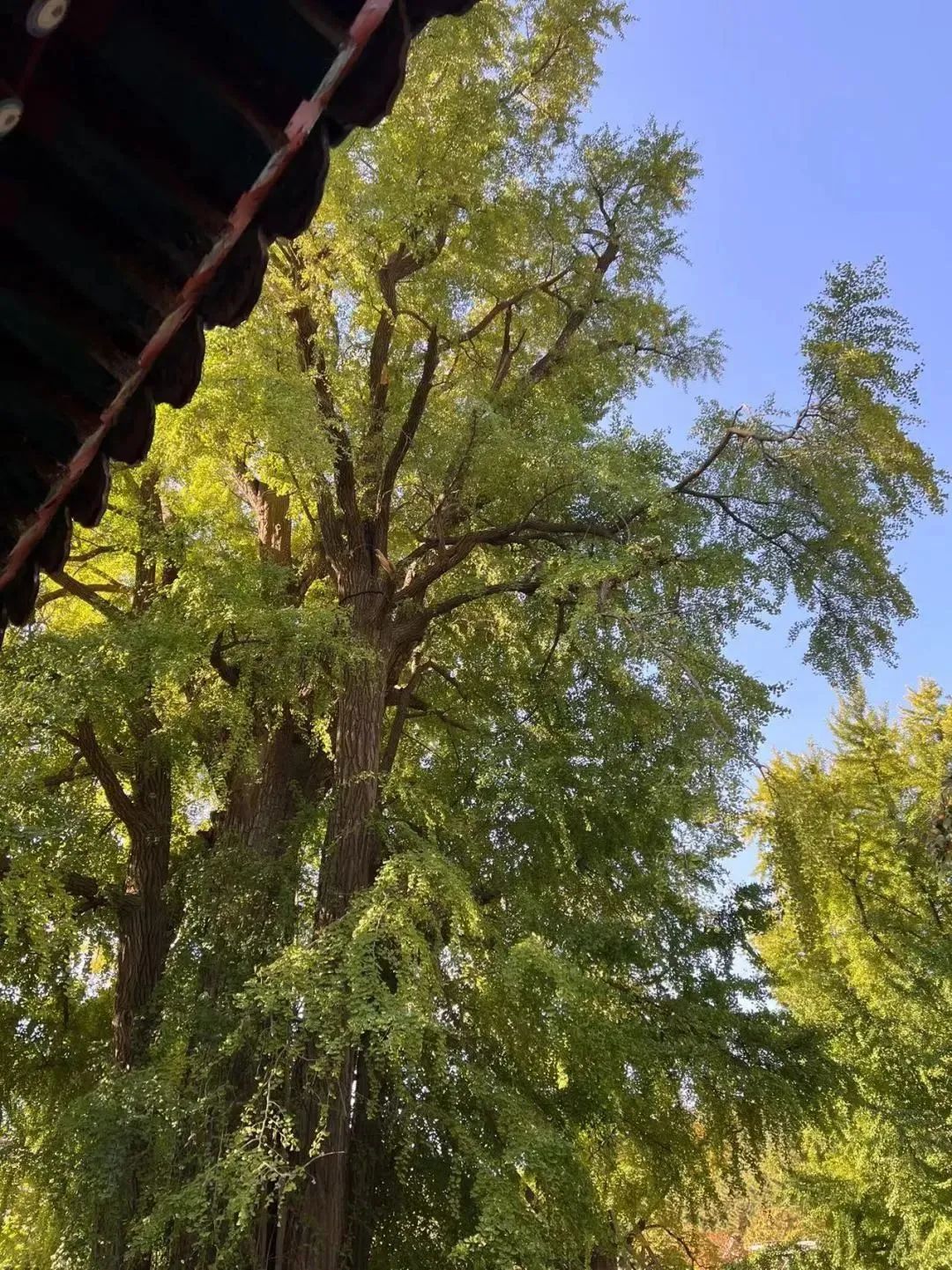 目前古银杏树的树叶已开始逐渐变黄,虽暂时无法收获最耀眼的那一抹金黄,却可以欣赏到“绿扇子镶金边”的银杏叶景观。