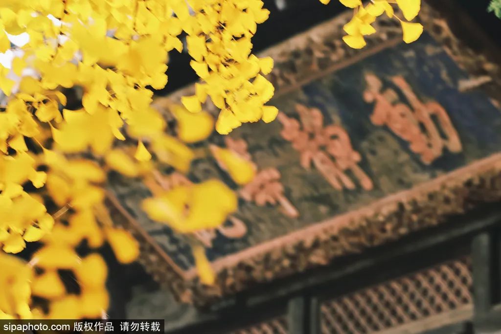 深秋,两株古银杏树尽披金甲,在阳光的映衬下熠熠生辉,尽显古刹神韵。金黄的银杏叶挂在枝头,厚厚的落叶似黄金满地,使得整个庭院宝气生辉。