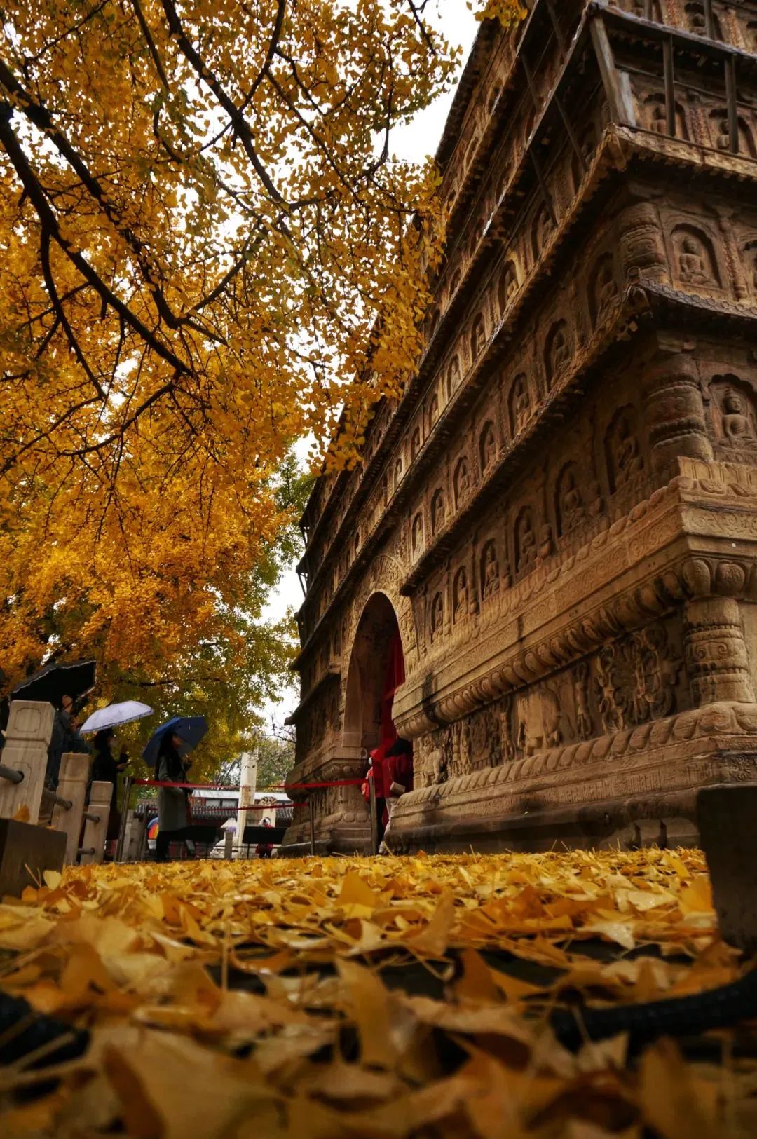 每到10月底至11月中上旬,五塔寺的古银杏树完全变黄,秋风吹过,散落一地金黄,无数游人纷至沓来,只为一睹古银杏树的芳容。