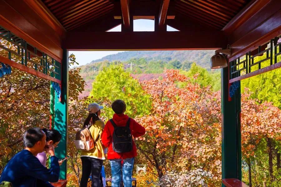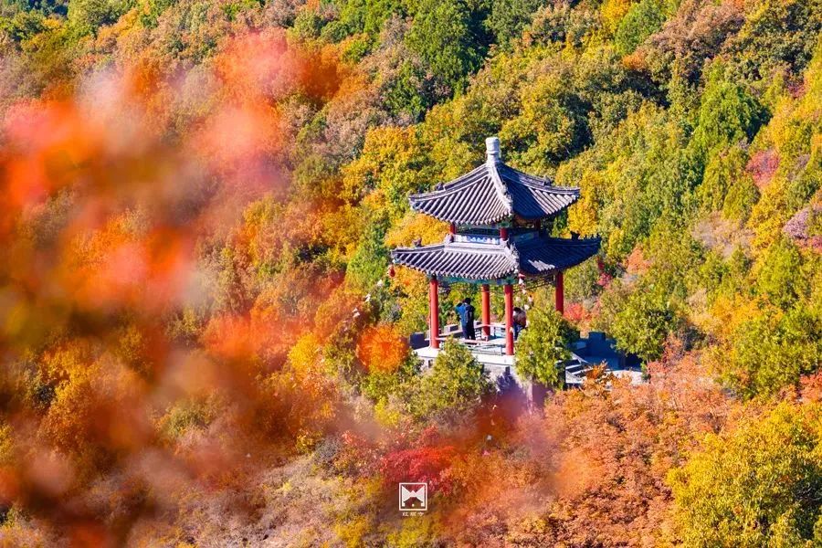 静静坐在山间的廊亭里,抬头欣赏空旷蔚蓝的天空,低头俯瞰隐匿于斑斓秋色中的殿宇楼廊,看山、看水、看叶,放空身心,尽情感受红螺寺秋日的美好。