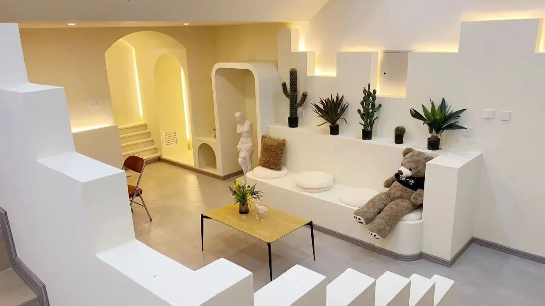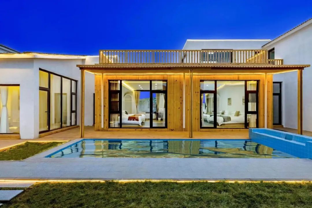 宿集建筑占地面积约为6000平,设有20间独栋别墅,共有83间客房。设计的亮点在大量几何线条的应用上,细长或方正的矩形皆自成画框,外部景观天然入画,极大丰富了空间感和视野层次。让逃离城市的人们“住进白房子,做个白日梦”。房间内保持了更加自由的布局,对冗余功能的删除,让住宿者在相对开放的空间里,得到更好的情绪沉浸。除了宽敞的起居室和卧室,宿集别墅配有私人泳池、私汤泡池、私家草坪露天观景台。