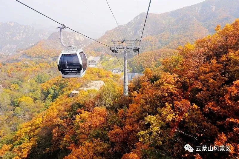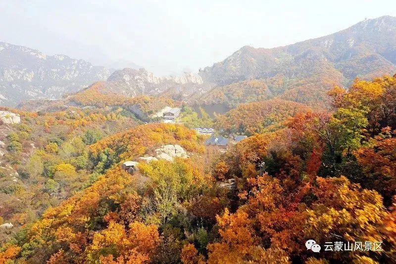 深秋时节的云蒙山,落叶松、蒙古栎、桦树金光闪闪;榭树、黄栌红叶流丹;油松、侧柏散落在红黄的茎叶之间,漫山遍野五彩斑斓,美不胜收。