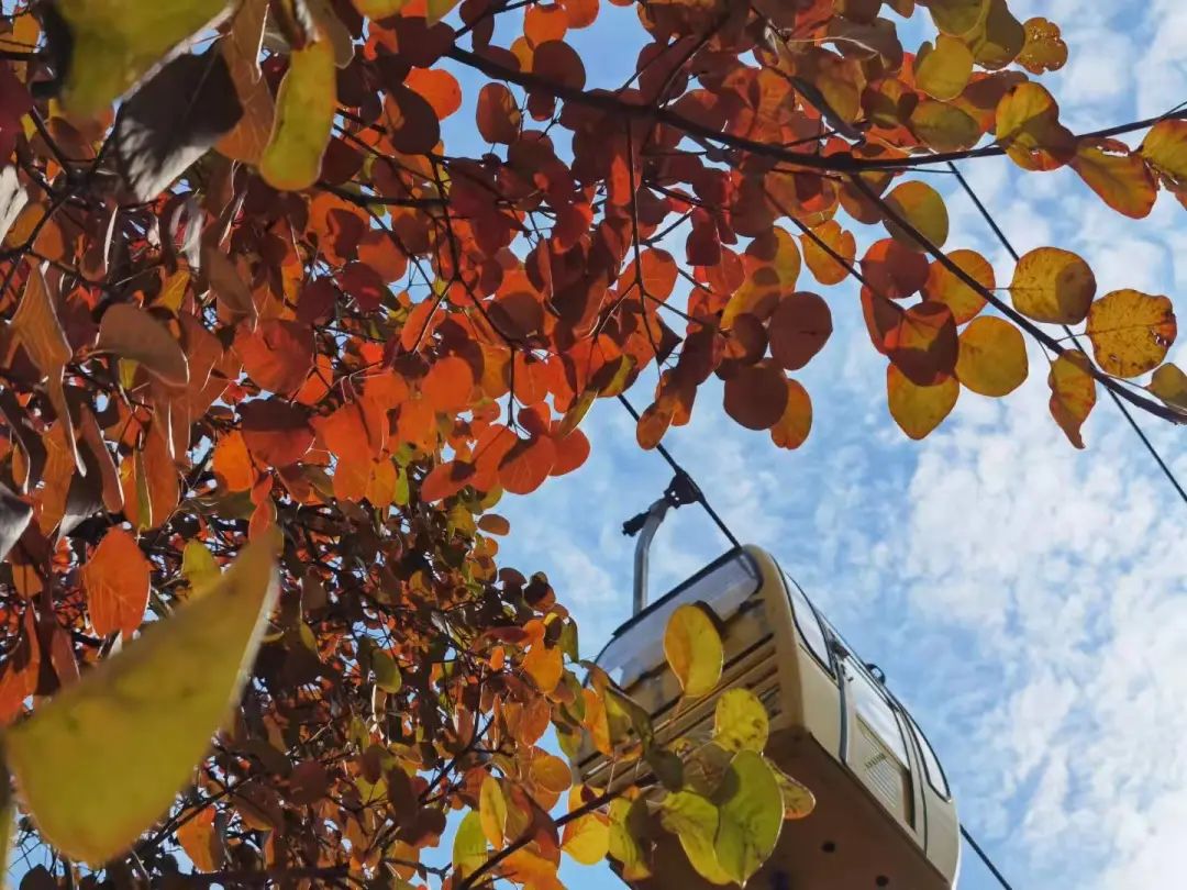 在八大处公园,游客可以乘观光缆车俯瞰漫山红叶,也可以驾滑车飞驰在丛林之中,以不同的视角欣赏秋色。