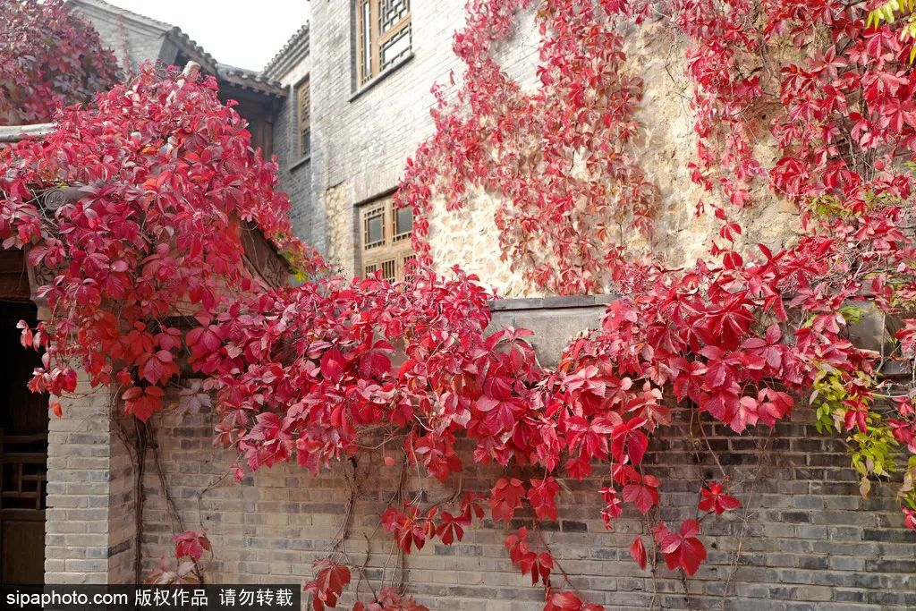 秋日,汤河两岸的爬山虎为古北水镇渲染出一抹靓丽的鲜红,青砖黛瓦披上彩衣,显得活泼又热闹。乘上一只小船,慢慢观赏秋色,怡然自得。