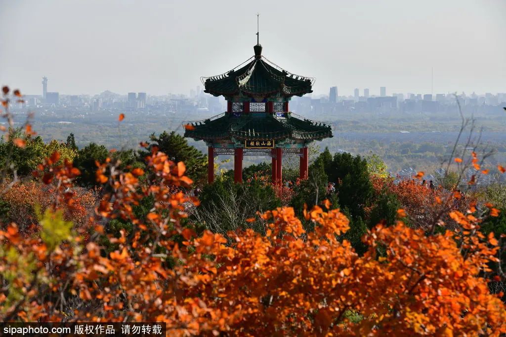 当前,八大处公园内的黄栌、火炬树、元宝枫等树木的叶子已变成红色,加之青松翠柏交相映衬,间或还有明黄的银杏叶,山间呈现出红橙黄绿交织叠加的缤纷色彩。