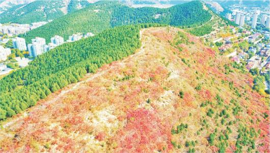记者 刘飞跃 报道 深秋时节,济南周边的山体层林尽染,市民不出远门就能欣赏漫山红叶。济南蝎子山从高空俯瞰,以山脊为界,南侧的黄栌树火红一片,北侧的松树终年常绿,再现“半山青翠半山红”景观。