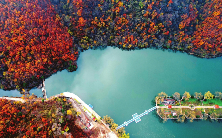 11月1日,山西省运城市垣曲县望仙大峡谷无人机俯瞰图。这里处在历山原始森林西南部,山清水秀,林木茂盛,风光优美。深秋时节,金灿灿红彤彤的黄栌遍布群山,峡谷里呈现出色彩斑斓的秋景。